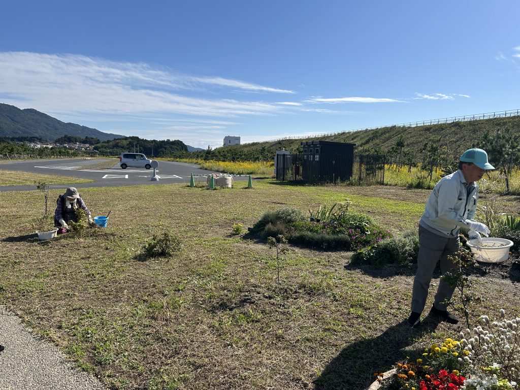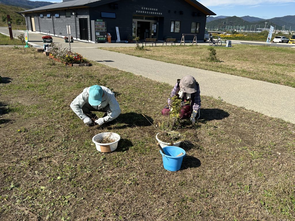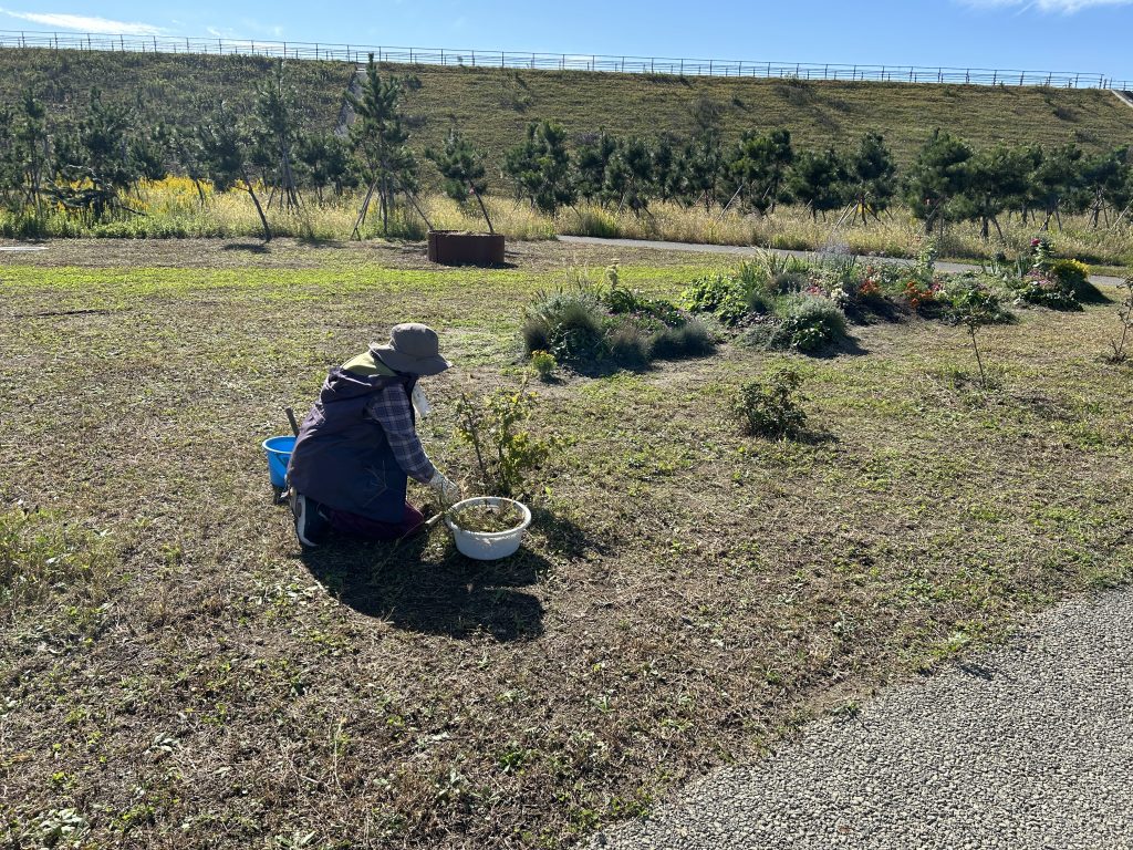花壇周辺の草刈り作業も終わっていて、花壇の中も雑草はほぼない状態でしたので、花壇の周りのハマナス救出作戦を行いました。